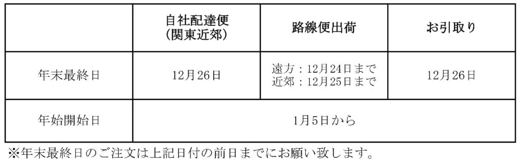 年末営業最終日:12月27日(土)まで(社内棚卸業務の為、平常営業致しません。)